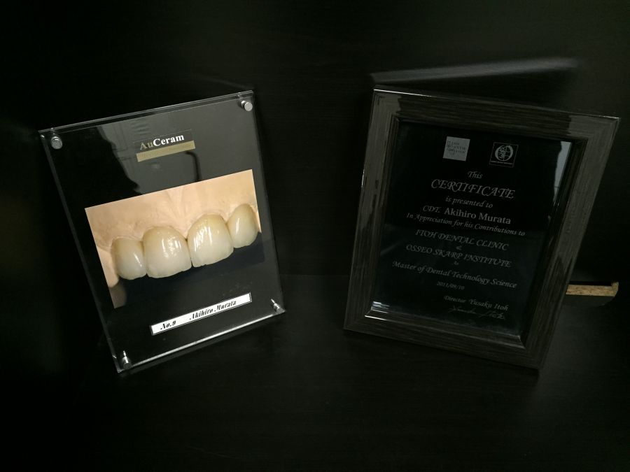 伊藤歯科OBは、卒業証書の意味の盾を持っています。その他にも私もいろんな学会やコースを修了したので、結構たくさんの修了証書を持っています。しかし、私はあまりラボにそういうものを飾るのが好きではないので飾っていません。だけど、伊藤歯科の盾とアメリカのラボを卒業した時に頂いた盾だけは飾ってあります。私にとって本当に価値のある証書はこの二つだけです。見るたびに気持ちが引き締まるんです。