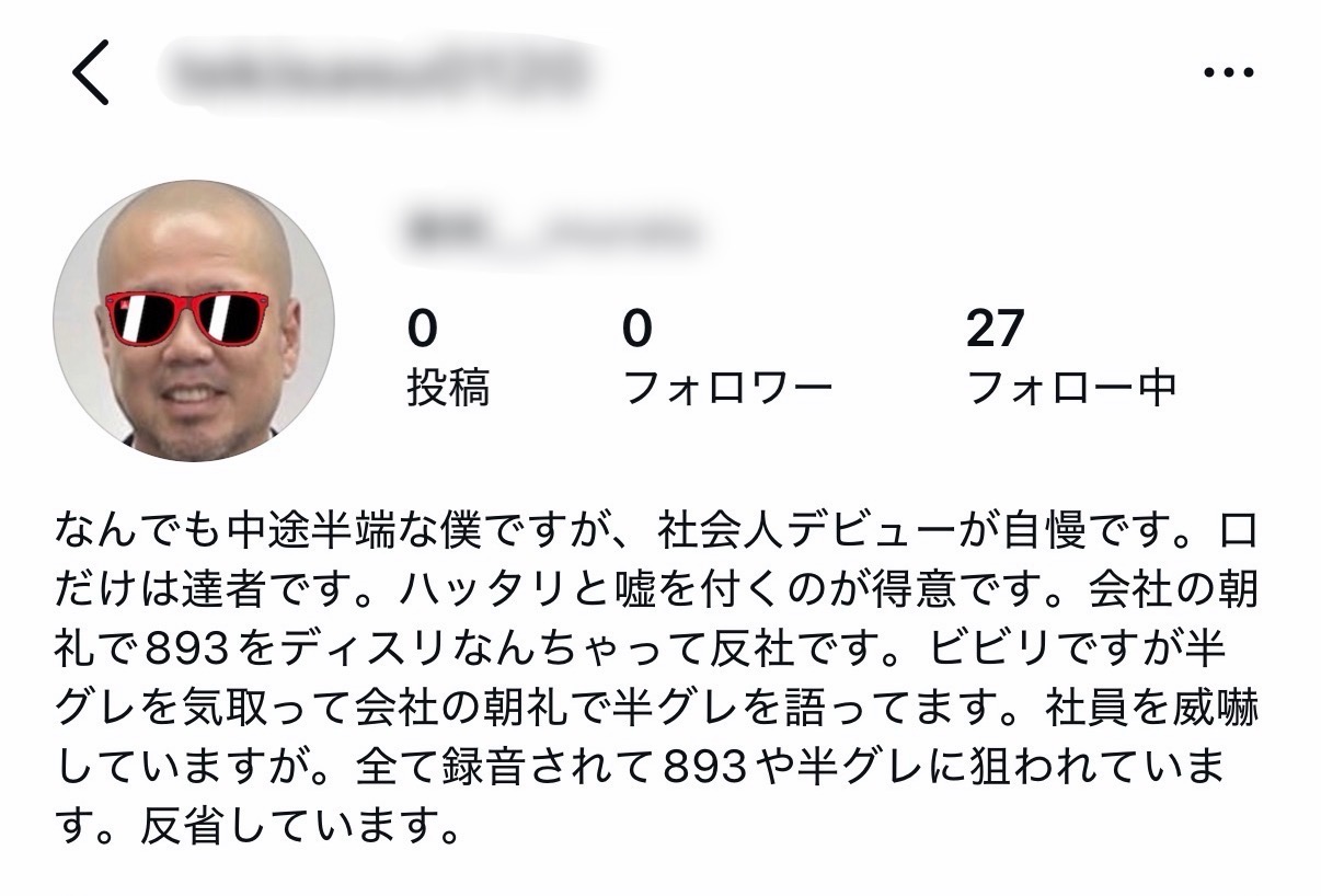 まあ最初はちょっとだけムカついたんですが、冷静に文章読むと、「なんちゃって反社」「893と反社に狙われている」「社員を威嚇している」等々以外は、まあまあ的を得てるような気もしますね(笑)。