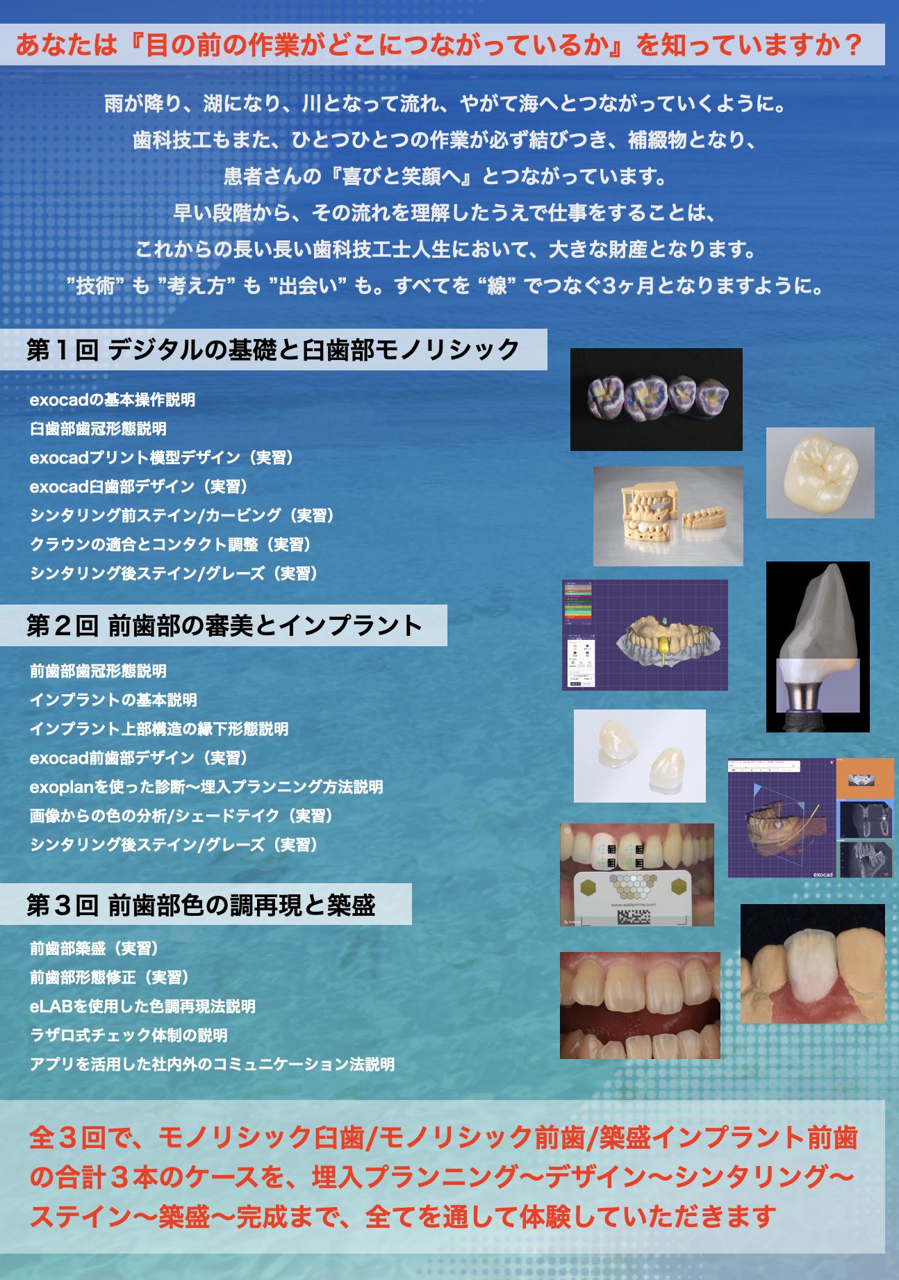 3ヶ月を通じて、『モノリシック臼歯 / モノリシック前歯(インプラント) / 築盛前歯』の合計3症例を、『埋入プランニング → デザイン → シンタリング → ステイン → 築盛 → 完成』まで、一連の流れを通して体験していただきます。