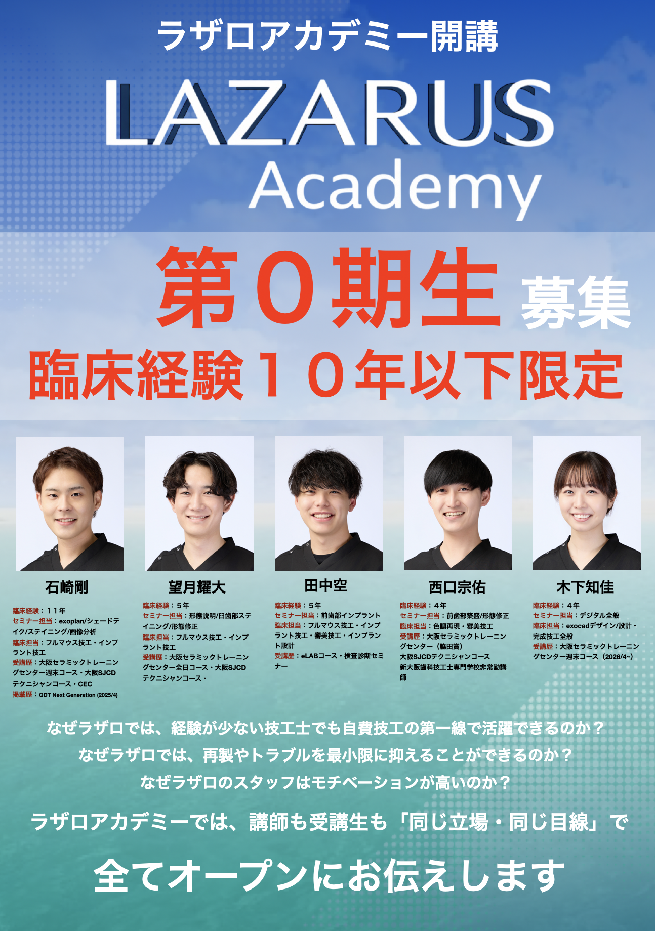 今までみたいに全国的に名前の通っている技工士が講師を務めるわけではない分、若手技工士が手の届く範囲の受講料で開催しつつ、ラザロとして大切にしている考え方や取り組み、教育方針なんかはしっかり伝えていきたいと思っております。