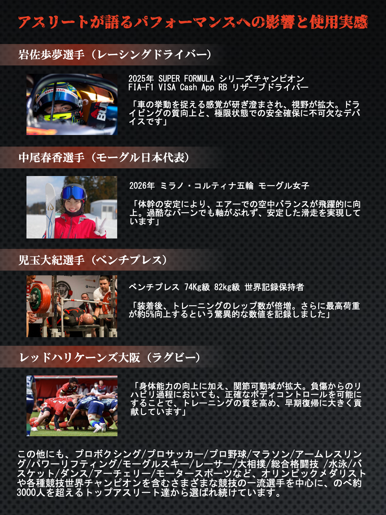 今回は契約の都合上、フライヤーには一部のアスリートしか紹介していませんが、本当に「誰でも知っているあの選手達」もたくさん田中氏のコンセプトで作製されたマウスガードを使用し、素晴らしい成績を残されています。