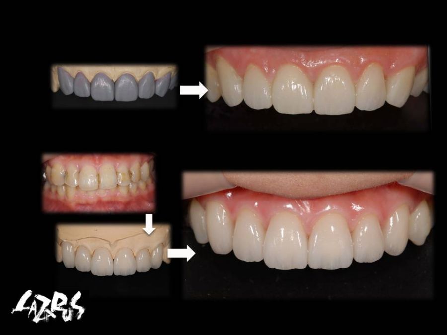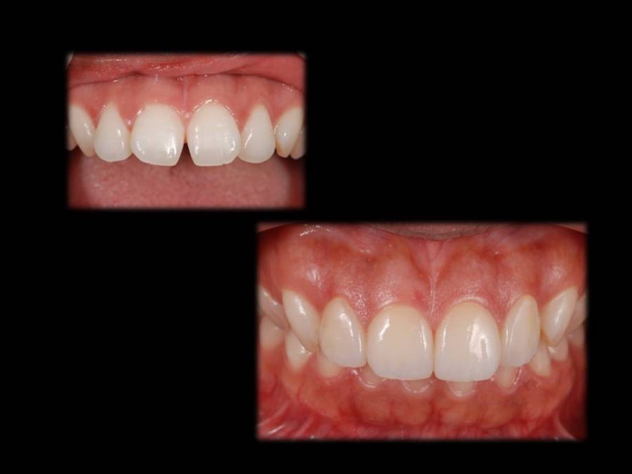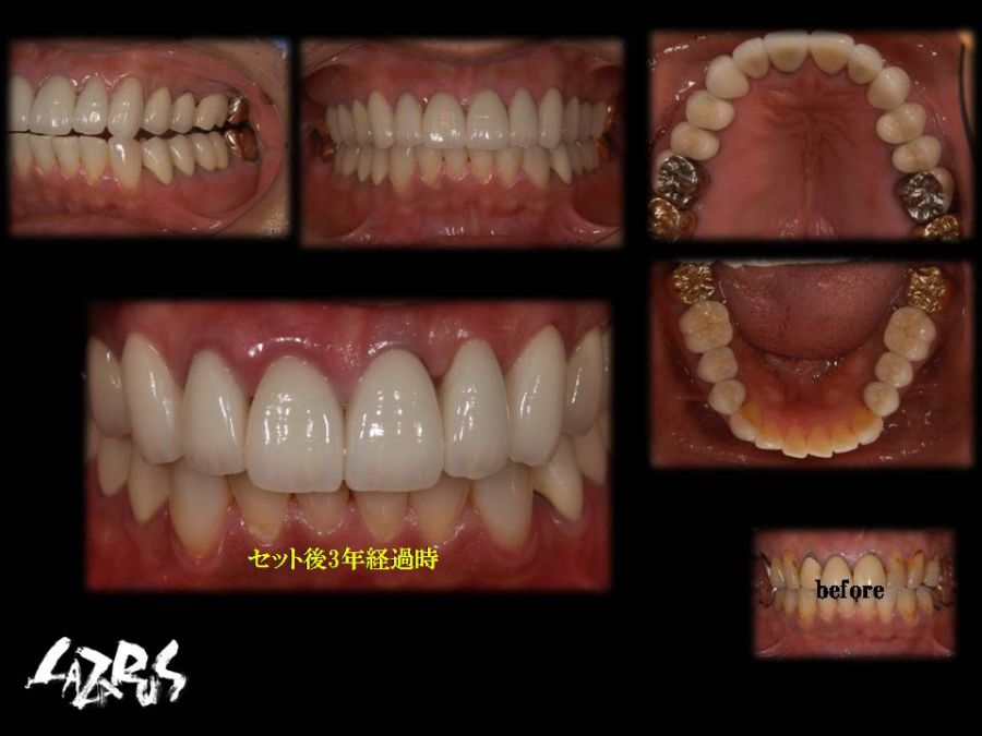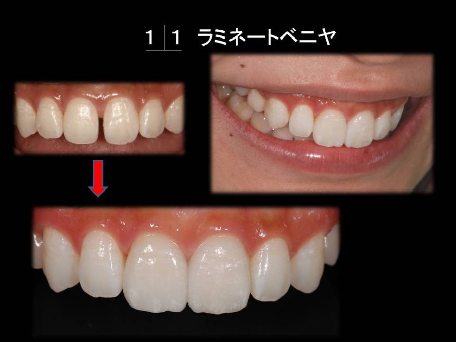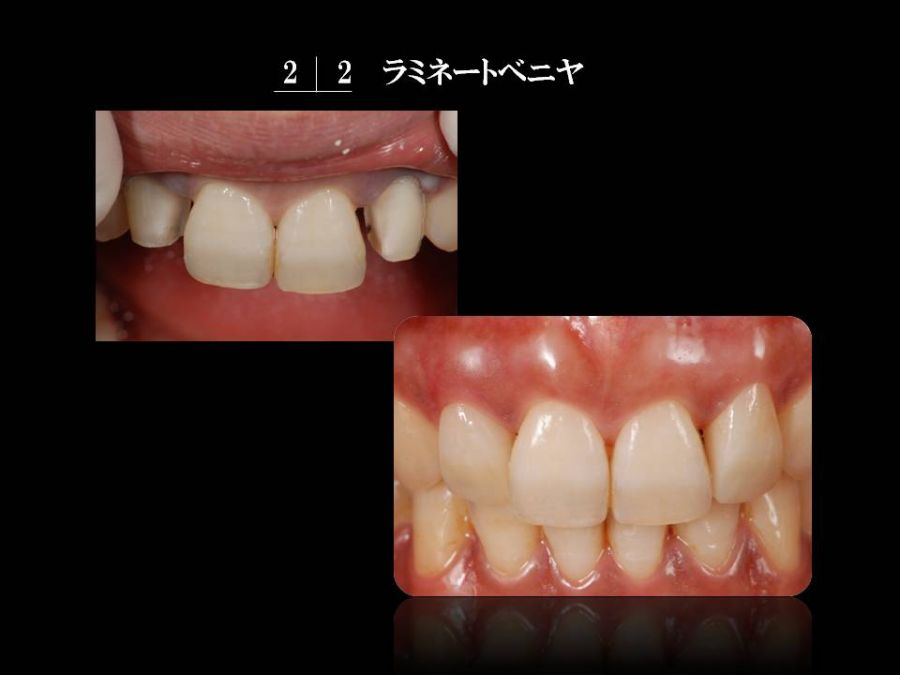患者は23歳女性、正中の空隙を主訴に来院されました。診断用ワクシングにてパーシャルベニヤ・正中へのCR・フルベニヤの3パターンをそれぞれの利点、欠点を説明した上で提案しましたが、患者様の要望にてフルベニヤにて対応しました。セット後の歯肉の状態も良好で、患者様にも大変喜んでいただけました。「誰からも気づかれない」とちょっと寂しげでしたが、技工士にとっては最高の褒め言葉です。