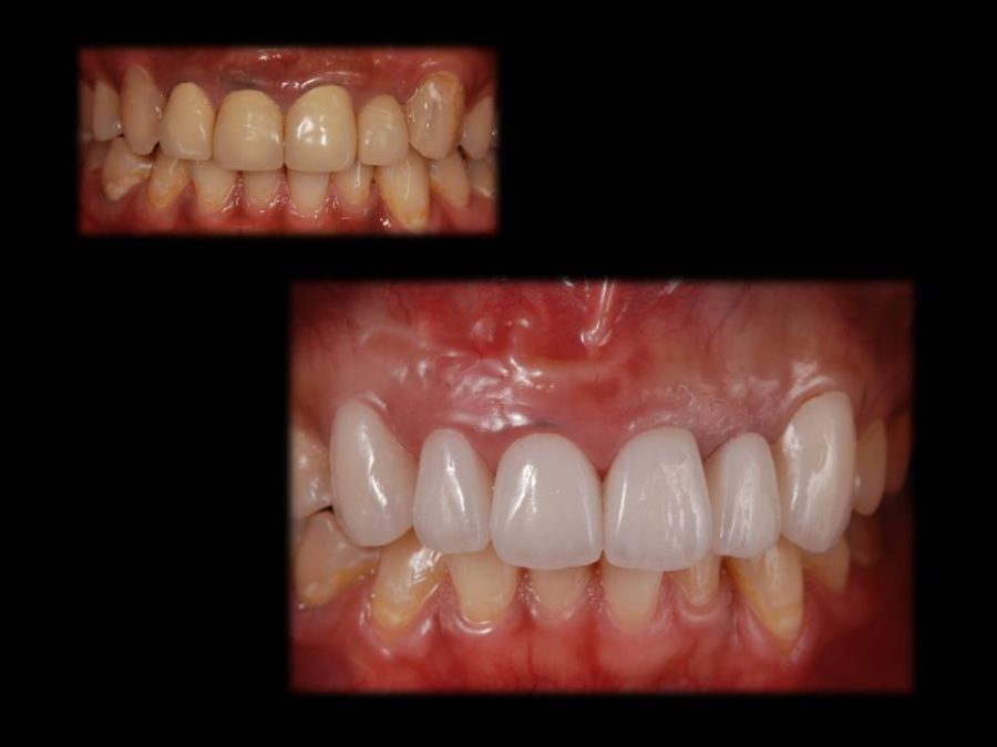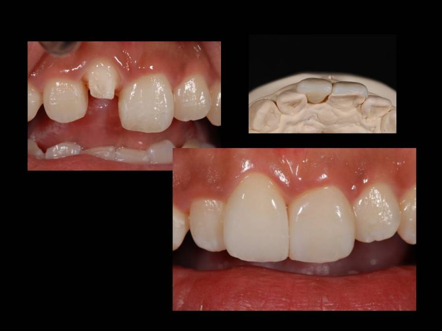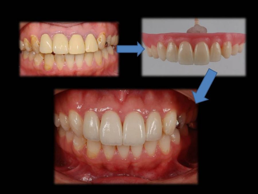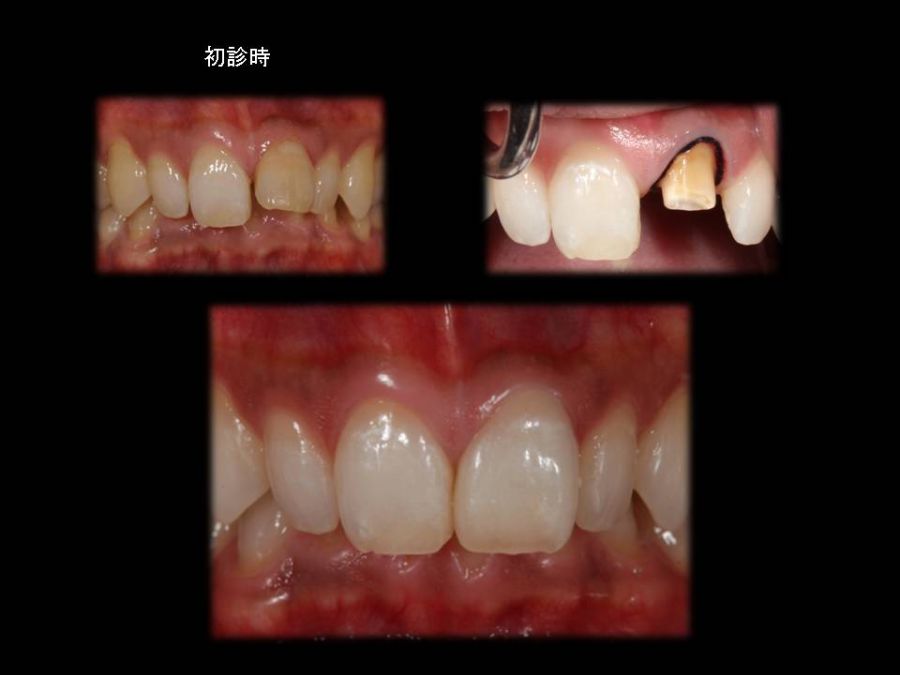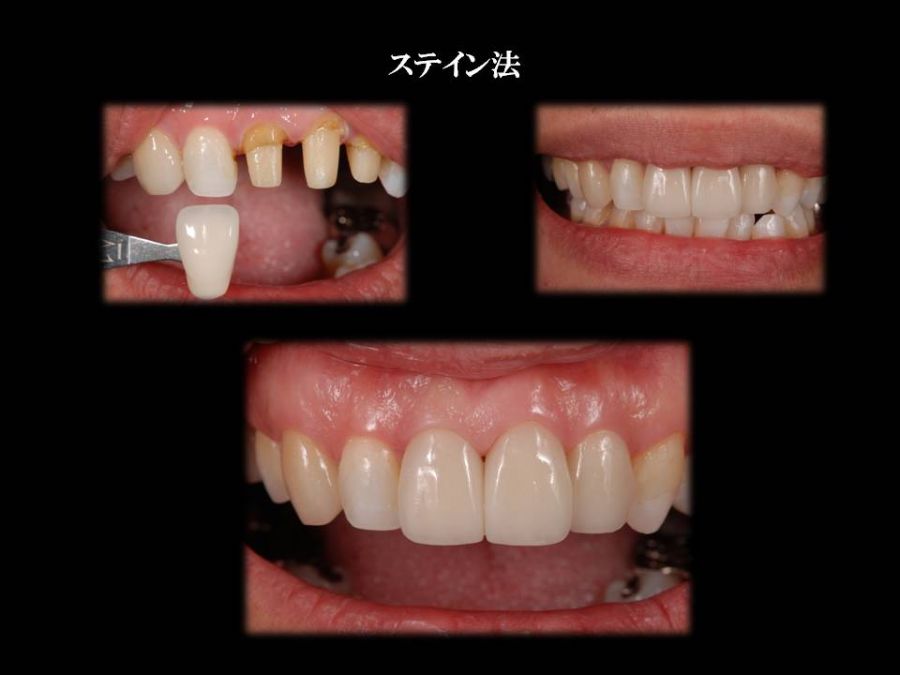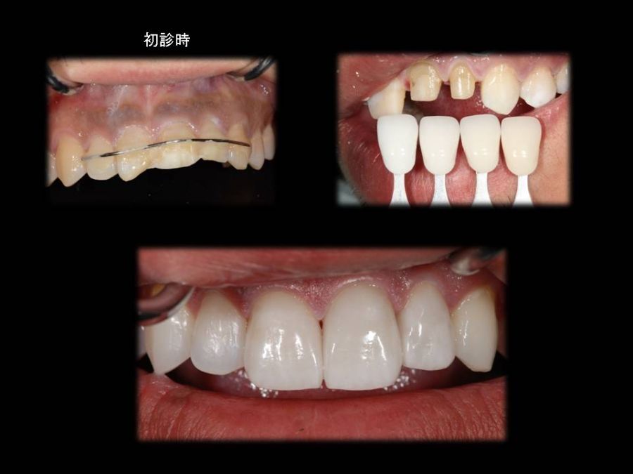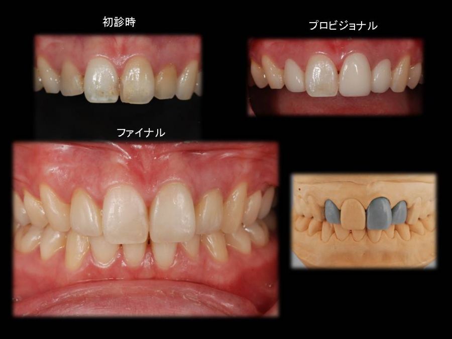 患者は27歳女性。前歯部の審美障害を主訴に来院された。他院にて装着された両側中切歯のメタルセラミックに強い嫌悪感を感じており、初診時の状態を観察すると・歯頚ラインの不揃い・マージンラインの黒ずみ ・色調の不調和 ・形態の不調和 ・無意味な連結などの問題点が確認できた。本来ならば矯正や歯肉形成術、もしくはプロビジョナルレストレーションにて歯冠・歯肉の形態を煮詰めた上で最終補綴を作製したいところだが、目前に患者自身の結婚式を控えており、何とか1回ですぐにきれいにして欲しいというのが患者の強い要望であった。両側3は補綴せずに、2~2のみをとにかく白く綺麗に並べてほしいということだったので、両側1の歯頚ラインの不揃いはクラウンのカウンツアーで整え、2~2の唇舌的なギャップは両側2へのノンプレップベニアにて整える事にした。右上1の歯頚ラインを理想的な所まで「押し上げる」為、石膏模型の歯肉部を調整し歯頚部にハーフポンティック形態を付与した。妥協的な補綴プランではあったが、1回で患者の満足を得る事が出来た。