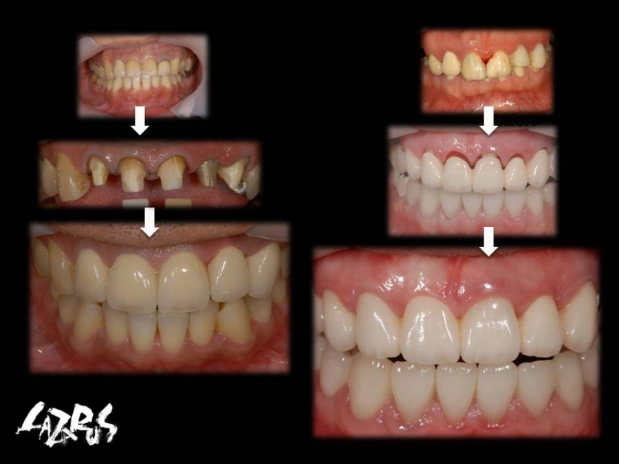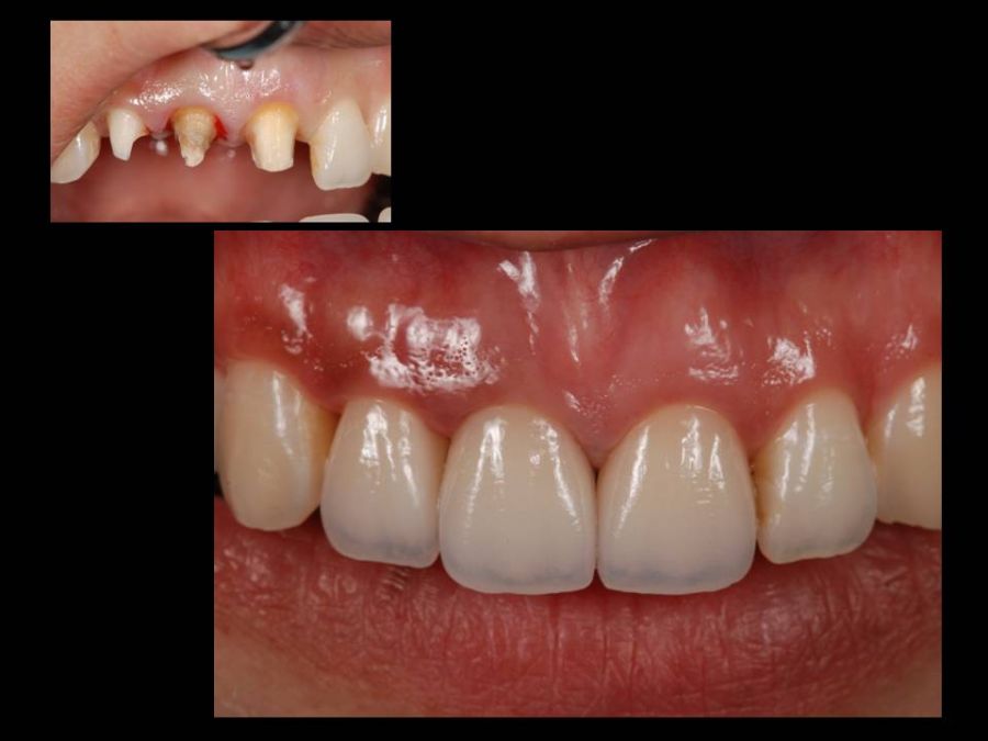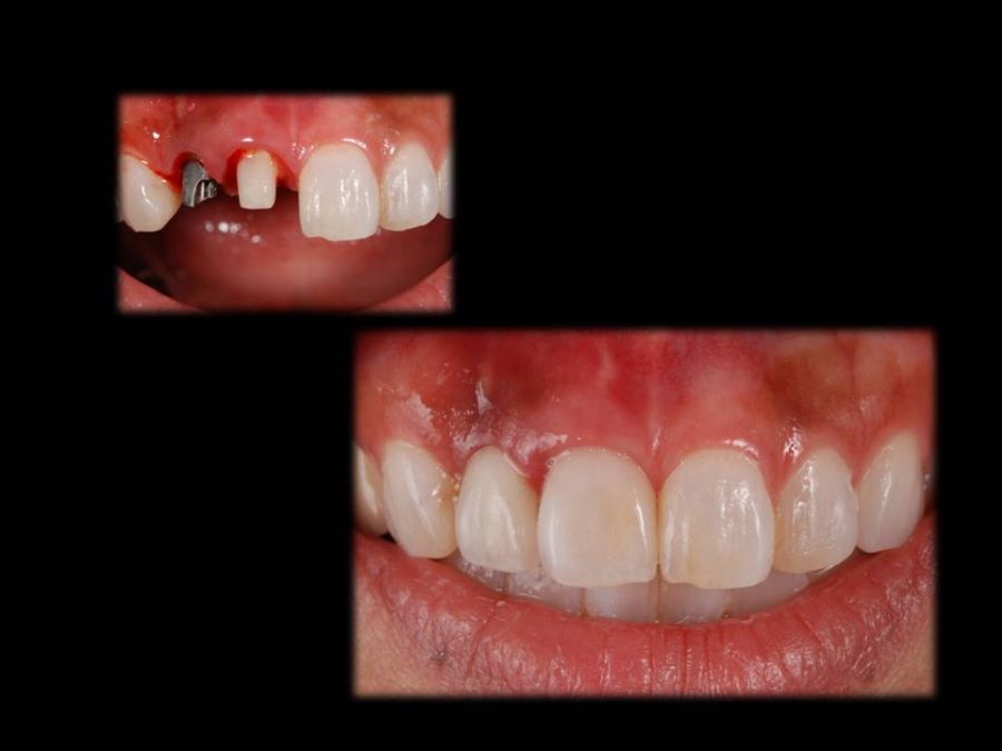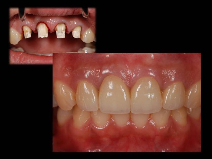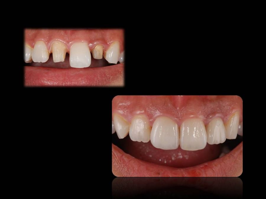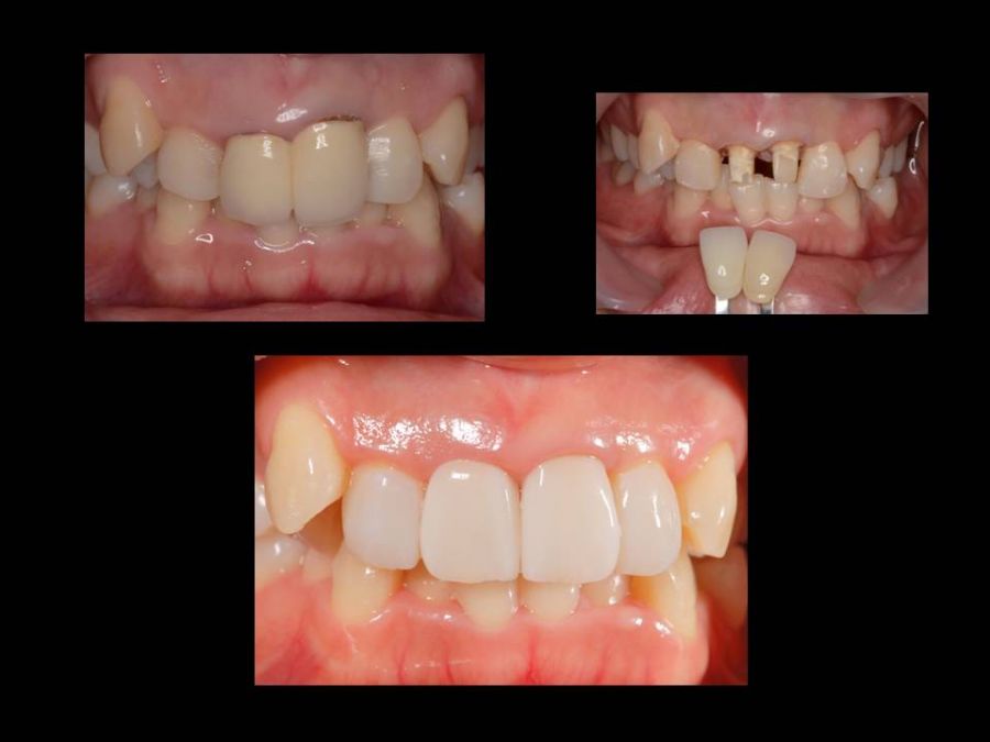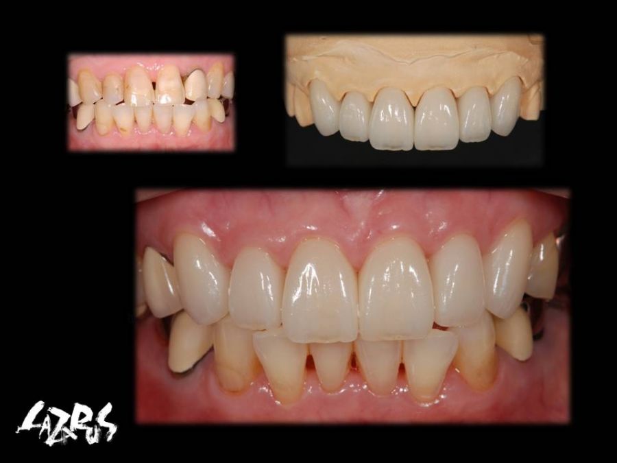 患者は27歳女性。前歯部の審美障害を主訴に来院された。他院にて装着された両側中切歯のメタルセラミックに強い嫌悪感を感じており、初診時の状態を観察すると・歯頚ラインの不揃い・マージンラインの黒ずみ ・色調の不調和 ・形態の不調和 ・無意味な連結などの問題点が確認できた。本来ならば矯正や歯肉形成術、もしくはプロビジョナルレストレーションにて歯冠・歯肉の形態を煮詰めた上で最終補綴を作製したいところだが、目前に患者自身の結婚式を控えており、何とか1回ですぐにきれいにして欲しいというのが患者の強い要望であった。両側3は補綴せずに、2~2のみをとにかく白く綺麗に並べてほしいということだったので、両側1の歯頚ラインの不揃いはクラウンのカウンツアーで整え、2~2の唇舌的なギャップは両側2へのノンプレップベニアにて整える事にした。右上1の歯頚ラインを理想的な所まで「押し上げる」為、石膏模型の歯肉部を調整し歯頚部にハーフポンティック形態を付与した。妥協的な補綴プランではあったが、1回で患者の満足を得る事が出来た。