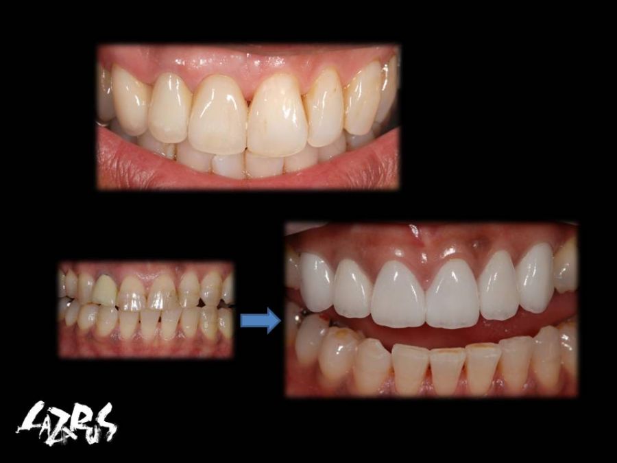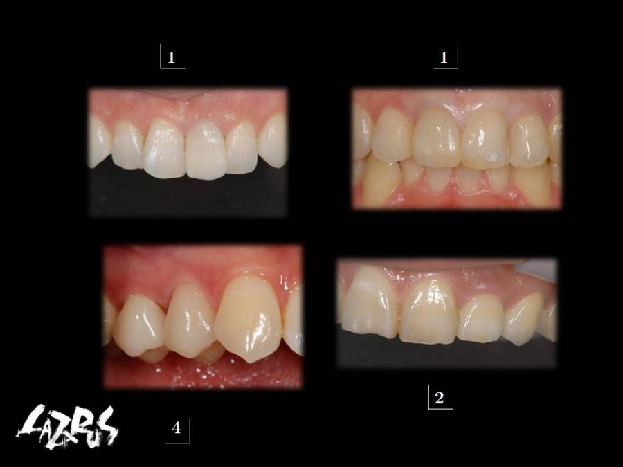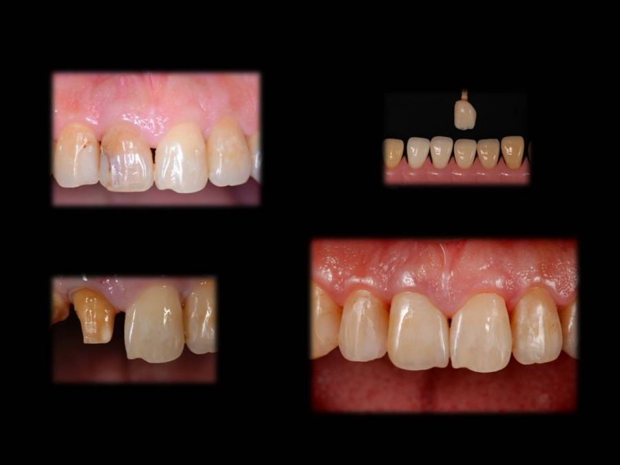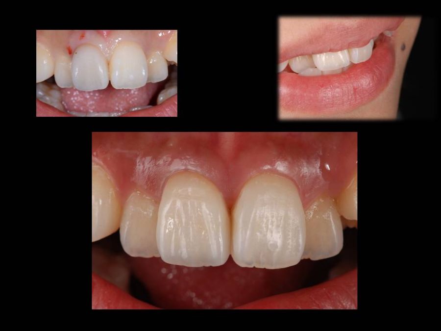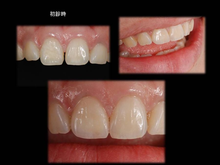 患者は24歳女性。自転車で転倒し右上1を破折し来院された。元々右上1が1本だけ飛び出したような排列であり、患者自身その状態に強くコンプレックスを感じていたので、この機会に綺麗にしたいという事であった。歯科医による口腔内テックの形態には嫌悪感を示し、両側同じ幅、同じ長さでの作製を希望されたが、左1を削る事には難色を示された。シェードテイク時によく歯冠を観察すると、破折線が確認できた。そこで右にはオールセラミッククラウン、そして両側の出具合を幅を整えると同時に、破折に対する補強の意味も込めてノンプレップベニアにてアプローチする事にした。こちらも妥協的なプランではあったが、最小限の侵襲で患者の満足を得る事ができた。
