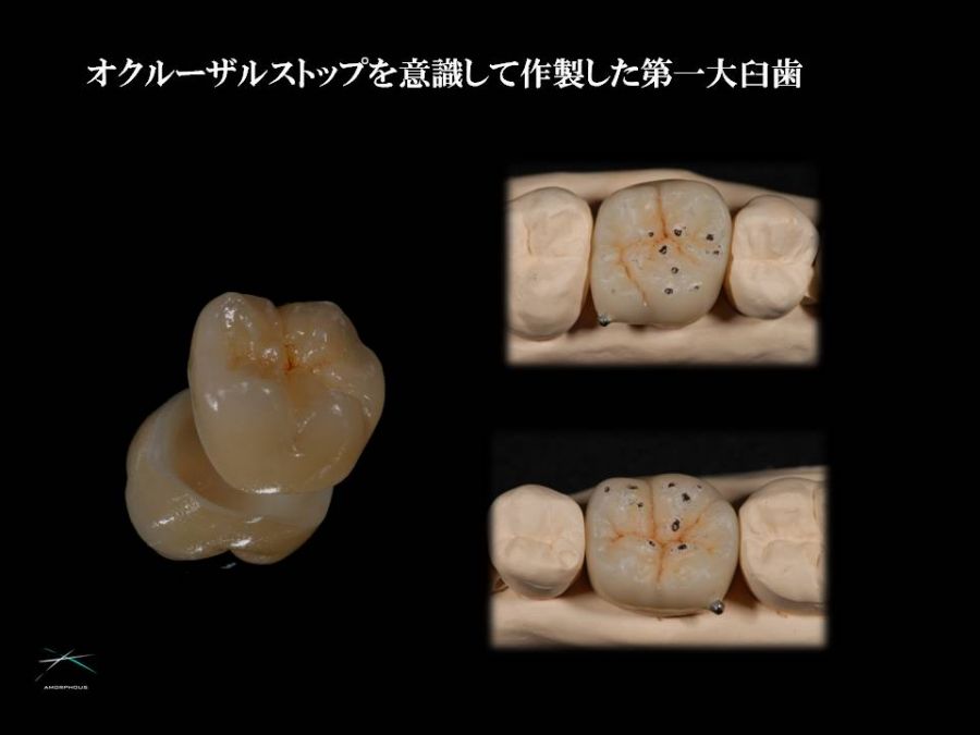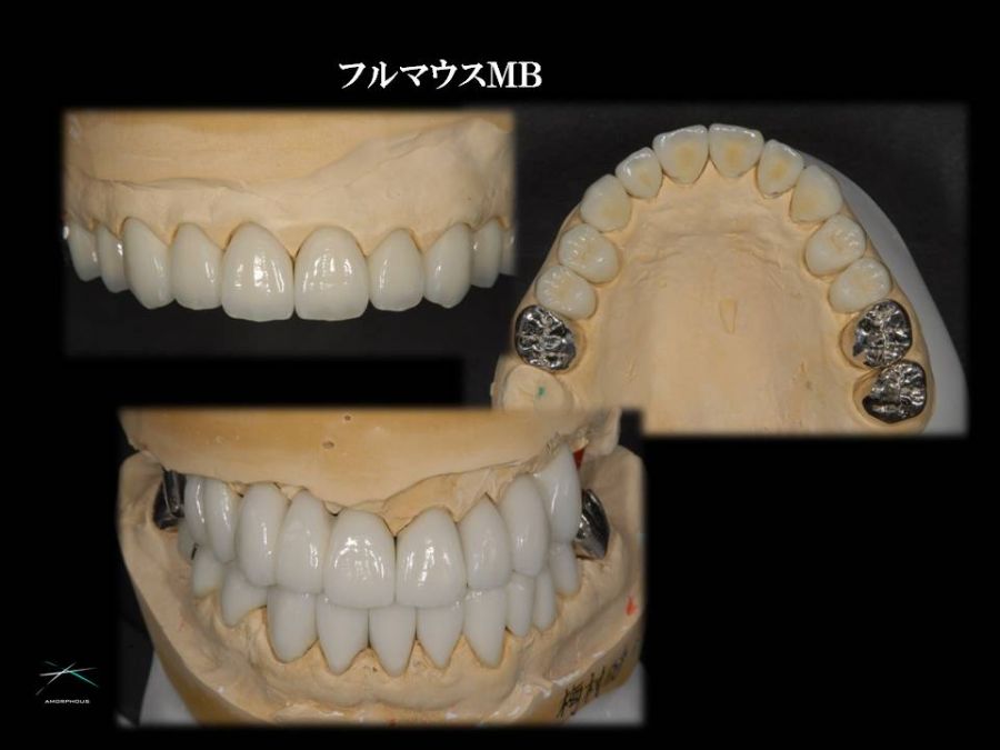 02 / メタルボンド 上下MB大臼歯 オクルーザルストップ(クロージャーストップ・イコライザー)を意識して作製。咬合の安定を図るには咬頭の斜面でオクルーザルポイントを求める必要があります。 ZOOM フルマウスメタルボンド フルマウス症例を一気に作製する場合は、確かなマウント技術が必要になります。このケースは自費と保険の混合症例ですが、こういう場合はもちろん保険技工もお受けさせて頂きます。 ZOOM MB単冠01 ZOOM MB単冠02 ZOOM フルマウスMB ZOOM ZOOM 症例紹介オールセラミックメタルボンドハイブリッドインプラントその他